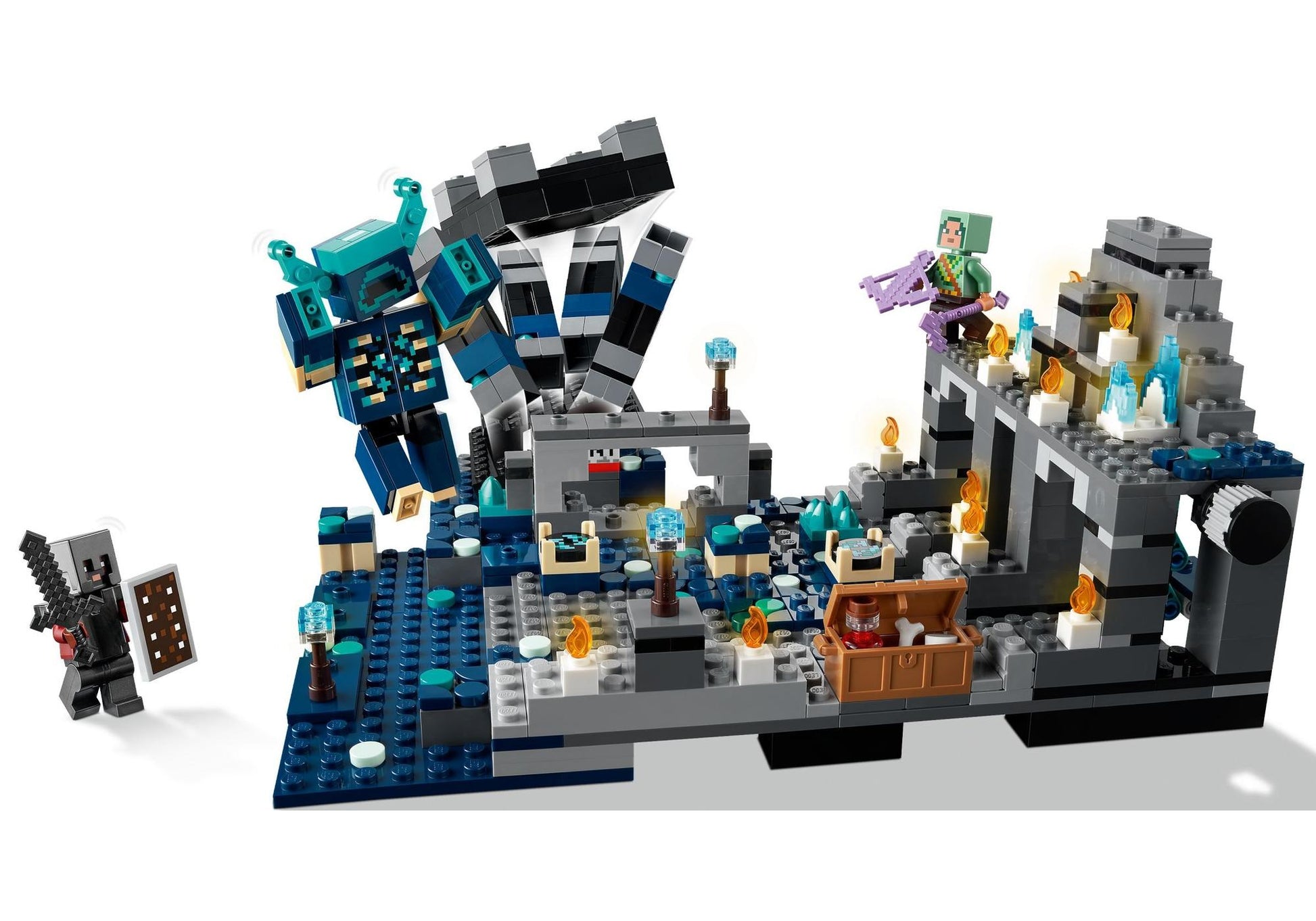 Kinder schicken zwei Minecraft Helden – den Arbalest-Ritter und den Netherit-Ritter – in ein spannendes Abenteuer in einem der anspruchsvollsten Biome des Videospiels. In ihren Rüstungen erkunden die beiden eine alte Stadt und graben nach kostbaren Erzen. Dreht man an einem Knauf, dann erhebt sich ein Wächter aus dem Tiefenschiefer im Untergrund, um die beiden Ritter aufzuhalten. Während des Duells können die Spieler einen Schalter umlegen, um eine heftige Explosion auszulösen. In den Ruinen befindet sich eine Kiste voller kostbarer Schätze: Sie enthält einen Knochen, einen Trank der Heilung und 2 Schneebälle. Für zusätzliches digitales Vergnügen beinhaltet die LEGO Builder App intuitiv nutzbare Vergrößerungs- und Drehfunktionen, die dein Kind das Modell beim Bauen näher betrachten lassen.