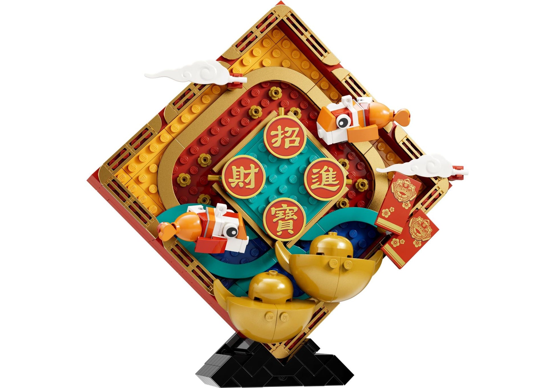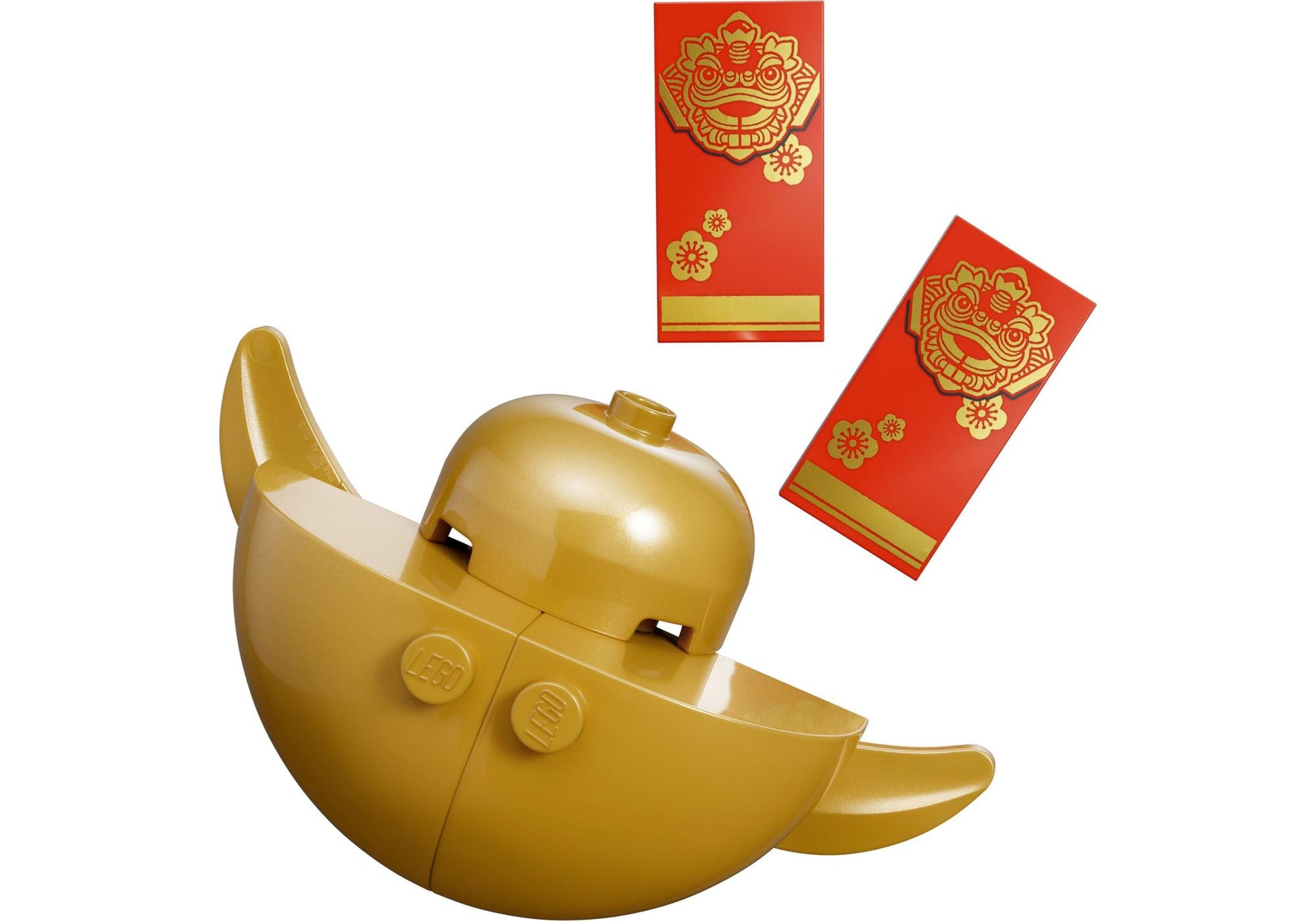 Das erste Modell umfasst zwei baubare Goldbarren im traditionellen "Yuan Bao"-Design, die für Wohlstand stehen. Ergänzt wird es durch die Grußbotschaft "Zhao Cai Jin Bao", zwei Koi-Karpfen als Glückssymbole und zwei rote Taschen, die Glück und Erfolg verheißen.