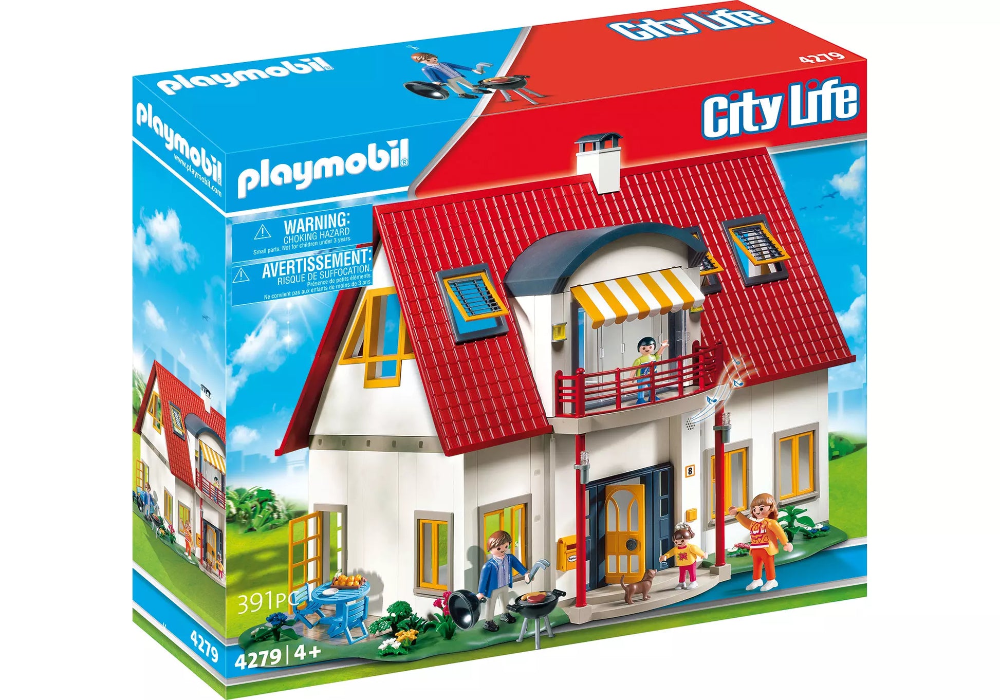 Entdecken Sie das moderne PLAYMOBIL Wohnhaus, das Wohnträume wahr werden lässt! Dieses detailreiche Set bietet eine funktionierende Türklingel, eine ausziehbare Markise über dem Balkon und kippbare Dachfenster. Die Terrasse ist mit stilvollen Möbeln und einem Grill ausgestattet - perfekt für entspannte Momente im Freien. Mit geräumigen Zimmern auf zwei Etagen bietet dieses Haus ausreichend Platz für das turbulente Familienleben. Die Dachterrasse mit Markise lädt zum Entspannen im Schatten ein, während der Grillbereich ideal für unterhaltsame Partys ist. Das Spielset enthält ein voll eingerichtetes Haus, vier PLAYMOBIL Figuren, einen süßen Hund, einen Tisch, Stühle und viele weitere Accessoires. Dieses Haus ist ein Ort, an dem sich die ganze Familie gerne aufhält und gemeinsame Erlebnisse teilt. Geeignet für Kinder jeden Alters, kombiniert dieses Set Kreativität mit fantasievollem Spielspaß und ist ein Must-Have für alle, die gerne neue Geschichten im familiären Umfeld kreieren.