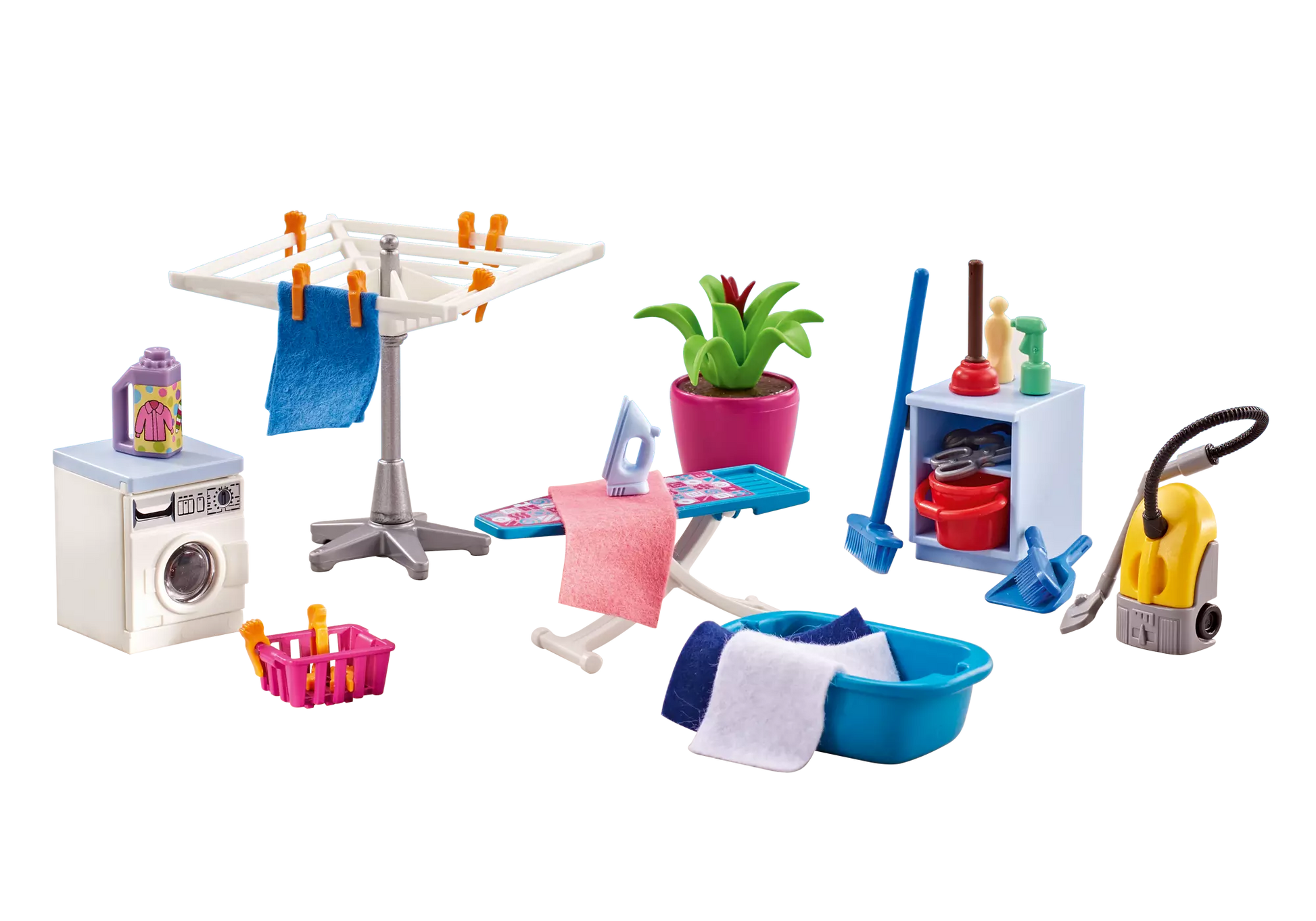 Bereiten Sie sich auf ein blitzsauberes Spielabenteuer vor mit der PLAYMOBIL-Hauswirtschaftsausstattung. Egal ob die Familie groß oder klein ist, das tägliche Saubermachen gehört dazu. Von Wäsche waschen über bügeln bis zum Staubsaugen - dieser Hauswirtschaftsraum hat alles, was nötig ist, um das Haus im Handumdrehen picobello zu machen.