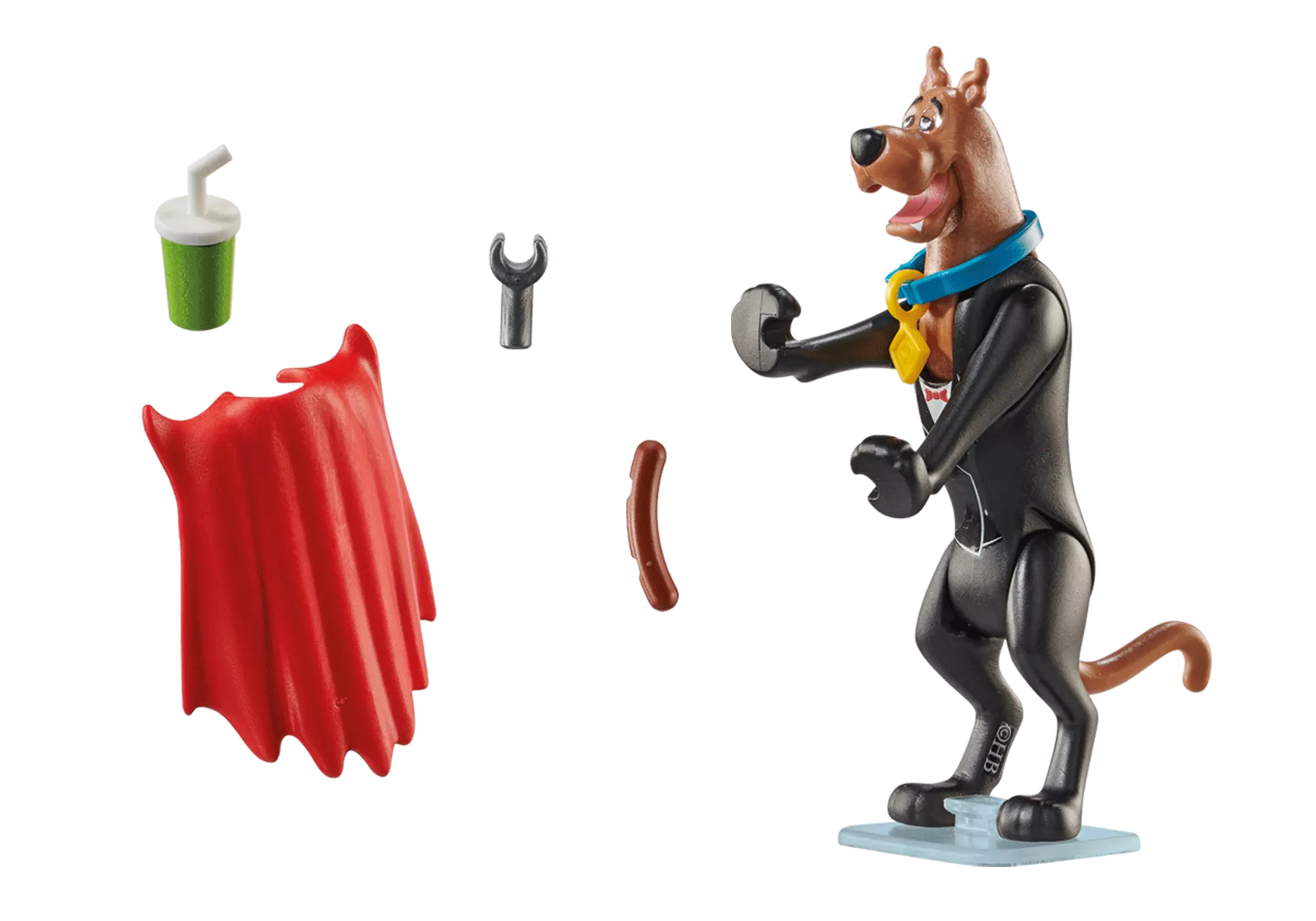 Auf der Suche nach den nächsten Schwindlern und Ganoven passt Spürnase Scooby sich selbstverständlich der Mission an: Die PLAYMOBIL SCOOBY-DOO! Sammelfigur Vampir ist niemand geringeres als Hauptfigur Scooby-Doo selbst in einem Vampir-Outfit. Mit rotem Umhang ausgestattet, geht es für den tierischen Detektiv auf Geisterjagd.
