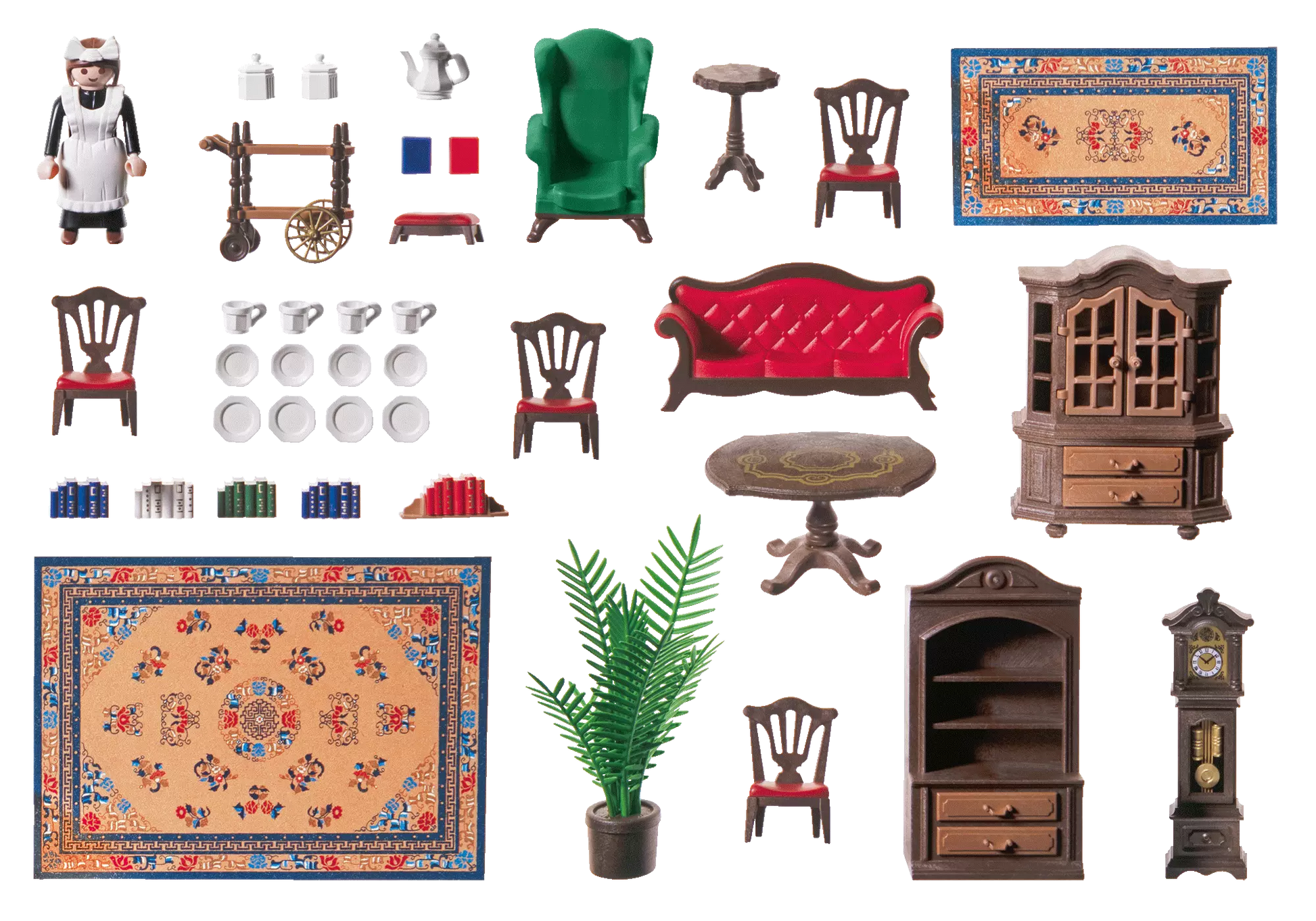 Entdecken Sie die nostalgische PLAYMOBIL Wohnzimmereinrichtung, perfekt für fröhliche Familientreffen und Teestunden. Die detailreiche Ausstattung umfasst ein Sofa, einen Bücherschrank, einen großen Tisch, vier Stühle, Geschirr und viele Extras. Das Hausmädchen bereitet sorgfältig alles vor, vom Porzellan auf dem Servierwagen bis zum Decken des Tisches. Nach dem Teetrinken laden der großzügige Ohrensessel und das elegante Biedermeiersofa zu gemütlichen Momenten ein. Im Bücherschrank warten spannende Geschichten darauf, entdeckt zu werden. Das 75-teilige Set beinhaltet eine PLAYMOBIL-Figur sowie Möbel und Accessoires für realitätsnahe Spielszenarien. Ideal für Kinder ab 4 Jahren, kann dieses Set mit dem nostalgischen Puppenhaus (70890) kombiniert werden, um das Spielvergnügen zu erweitern. Lassen Sie Ihre Fantasie in die Welt des eleganten Wohnzimmers eintauchen und erleben Sie unzählige Geschichten voller Spaß und Kreativität.