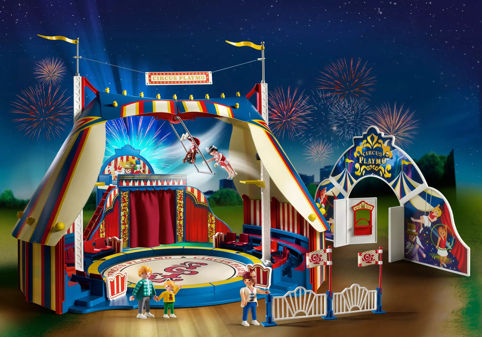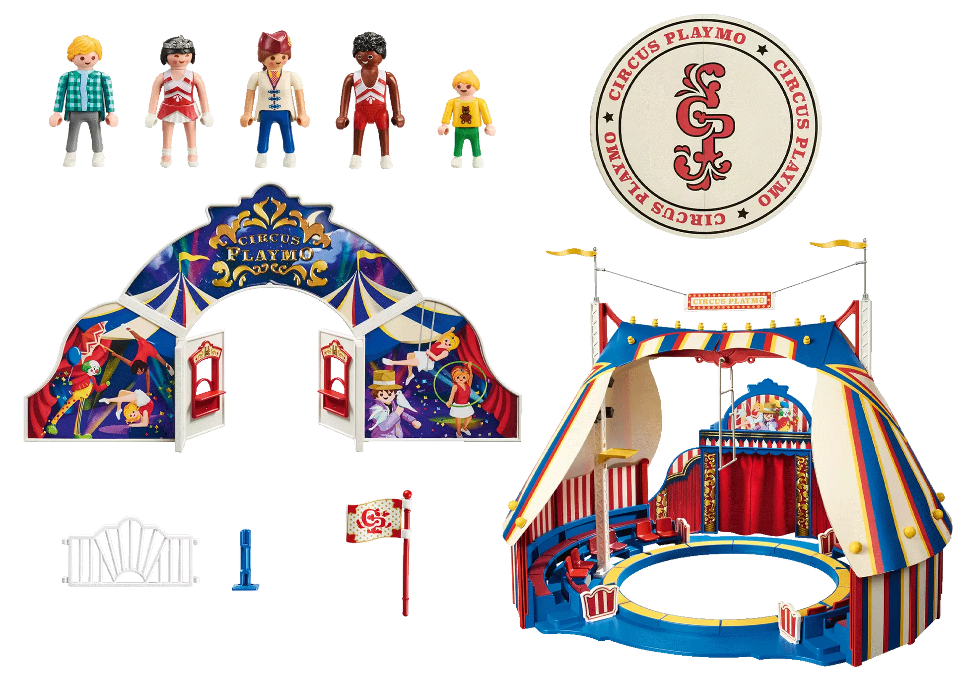 Entdecke die faszinierende Welt des PLAYMOBIL Zirkussets mit Zelt, Trapez, Artisten und begeisterten Zuschauern. Erlebe die Magie des Zirkus hautnah in deinem eigenen Kinderzimmer! Voller Vorfreude bereiten sich die Artisten auf ihre spektakuläre Show vor, während die Zuschauer gespannt darauf warten, was sie erwartet. Das bunte Zirkuszelt überspannt die Manege in all seiner Pracht, bereit, die Aufmerksamkeit auf sich zu ziehen und mit Glanz zu erfüllen. Sei fasziniert von den akrobatischen Kunststücken der talentierten Artisten, die scheinbar schwerelos durch die Luft gleiten und das Publikum in Staunen versetzen. Dieses detailreiche Set umfasst neben vier PLAYMOBIL-Figuren auch eine Kinderfigur, ein Zirkuszelt mit schwingendem Trapez, Sitzplätzen, Eingangstor, Zaun, Kasse und zahlreichen weiteren Accessoires. Mit diesem liebevoll gestalteten Spielzeug-Zirkus können Mädchen und Jungen ihrer Fantasie freien Lauf lassen und unzählige Spielmöglichkeiten entdecken. Geeignet für junge Zirkusliebhaber und alle, die von aufregenden Vorstellungen und fesselnden Darbietungen begeistert sind. Willkommen im fabelhaften Zirkus Playmo, wo die Show nie endet und Abenteuer hinter jeder Vorhang-Eröffnung warten!