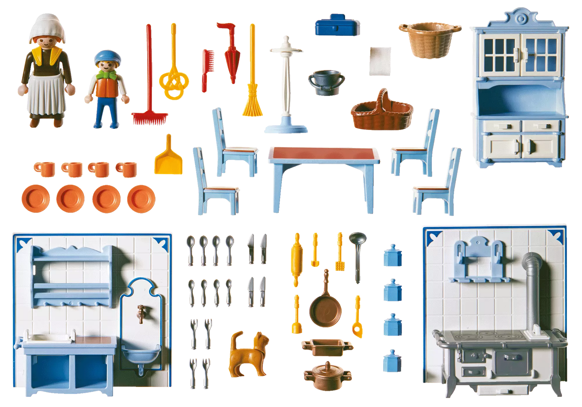 Entdecke die nostalgische Küche von PLAYMOBIL, die mit Liebe zum Detail gestaltet wurde und stundenlangen Kochspaß bietet. Diese charmante Küche verfügt über einen Holzherd, einen geräumigen Küchenschrank, ein Waschbecken und einen Spülschrank für realistische Küchenerlebnisse. Mit diesem Set, das eine PLAYMOBIL-Frau und ein Kind umfasst, können köstliche Mahlzeiten zubereitet werden. Von dampfenden Töpfen bis hin zu duftendem Essen - die Küche bietet alles, was kleine Köche brauchen. Das Set enthält zudem einen Tisch mit Stühlen, Regale, Vorratsdosen, Geschirr und Besteck für noch mehr Spielspaß. Die nostalgische Küche eignet sich perfekt für das große nostalgische Puppenhaus (70890) und lädt zu fantasievollen Abenteuern ein. Geeignet für Kinder, die ihre Kochkünste entdecken und ihren eigenen kleinen Haushalt führen möchten. Tauche ein in die Welt des Spielens und der Kreativität mit dieser bezaubernden Küche von PLAYMOBIL.