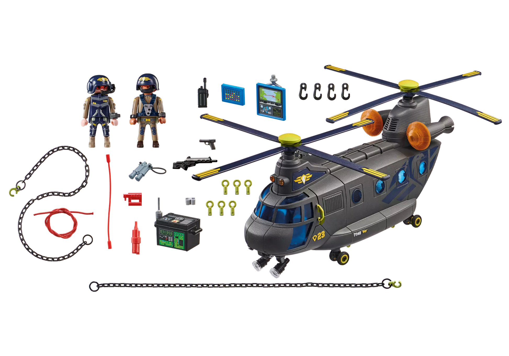 Entdecken Sie den detailreichen SWAT-Rettungshelikopter von PLAYMOBIL! Dieses 117-teilige Polizei-Spielzeugset bietet actionreichen Rollenspielspaß für Kinder ab 5 Jahren. Der Helikopter verfügt über ein Licht- und Soundmodul, das durch die Rotorbewegung aktiviert wird. Zwei PLAYMOBIL-Figuren und spezielle SWAT-Ausrüstung sorgen für realistische Polizeieinsätze. Der Hubschrauber bietet Platz für zwei Figuren im Cockpit und verfügt über ausklappbare Sitze im Laderaum. Mit einem Spanngurt können sensible Frachten gesichert und zusätzliche Ladung mit Transportketten befestigt werden. Die Vier-Doppelräder ermöglichen eine einfache Bodenfahrt und die verschiedenen Öffnungsmöglichkeiten des Hubschraubers bieten optimale Spielmöglichkeiten. Kombinierbar mit dem SWAT-Multi-Terrain-Quad für noch mehr Action. Erwecken Sie spannende Polizeieinsätze zum Leben!