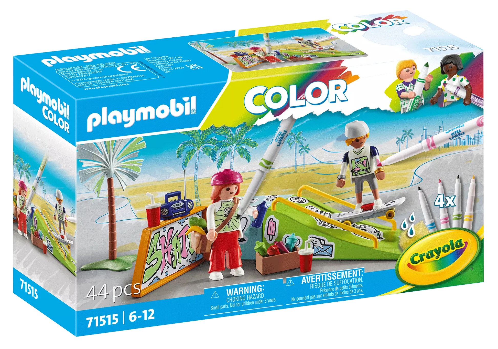 Erlebe Sport, Action und Malspaß mit dem PLAYMOBIL Color Skatepark! Hier wird nicht nur geskatet, sondern auch kreativ gestaltet. Die Graffitisprayerin verpasst den Wänden einen einzigartigen Look, während der Skater waghalsige Tricks auf der Rampe zeigt. Die Fußklemmung des Skateboards kann flexibel für verschiedene Figuren genutzt werden. Mit speziell beschichteten Etiketten und wasserlöslichen Stiften können Kinder ihre eigenen Designs kreieren und die Flächen immer wieder neu bemalen. Der mitgelieferte Schwamm ermöglicht gezieltes Korrigieren. Entdecke den Spaß am Skaten und kreativen Gestalten mit dem PLAYMOBIL Color Skatepark – ein Must-Have für kleine Künstlerinnen und Künstler!