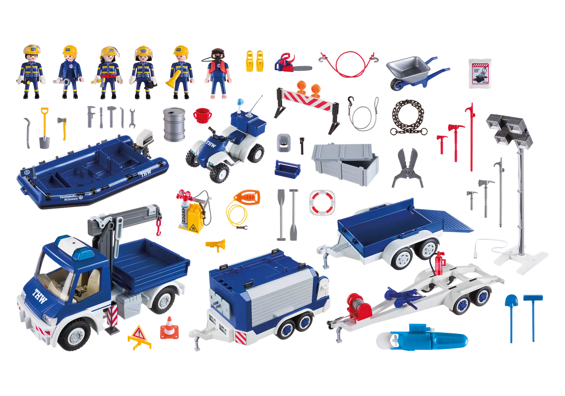 Wann immer die Feuerwehr oder Rettungsdienste technische Unterstützung benötigen, ist die technische Hilfsorganisation zur Hand. Egal ob Hochwasser, Feuer oder Unfall, die mutigen Rettungshilfer sind immer schnell auf der Stelle. Für die verschiedenen Rettungseinsätze hat das Rettungsteam eine große Flotte von Rettungsfahrzeugen wie LKW, Autos, Boote und Quads. Mit diesem detailreichen Set können spannende Rettungseinheiten wieder aufgesetzt werden. Das detailreiche Spielset Rescue Operation enthält sechs Figuren, einen LKW mit Lichtern, einen Anhänger mit Boot und Unterwassermotor, einen Anhänger mit Quad, Rettungsgurt, Schubkarre, diverse Rettungsgeräte und zahlreiche weitere Extras. Maße: LKW mit Licht: ca. 26,5 x 11,5 x 17-24,5 cm Anhänger mit Boot: ca. 27 x 11,5 x 10 cm Anhänger mit Quad: 17-22,5 x 11,5 x 9,5 cm.